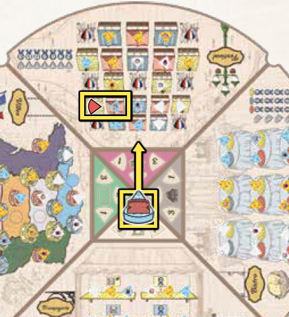 あなた(赤のプレイヤー)は、左のシルバーの棚にチーズを作り、ただちに任意のリソース1つを選択して獲得します。注文カード1枚を引くことを選択します。 |