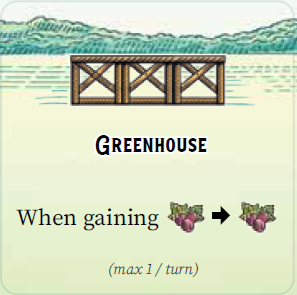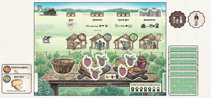 リソースを集めるには、利用可能なワーカーの1人をリソースタイルの自分に面した区画の空きスペースに置きます。各区画には、リソースの種類 (建物、家畜、フルーツ、注文)と3つのスペース(1、2、3のラベル)があります。
