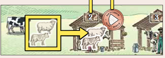 チーズを作るには、現在の区画の空いているチーズスペースにあなたのチーズトークンを置きます。次に、チーズと同じタイプのワーカーを上に置きます。