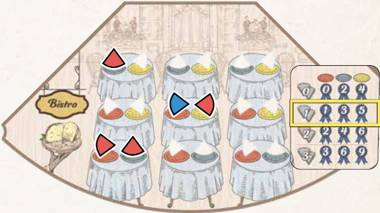 あなたのチーズトークンのある各プレートからポイントを獲得します。同じテーブルにあなたのチーズトークンを2つ置くとペアを作ります。ゲーム終了時に、ボード上の得点表を参照してください。あなたのペアの数によって、各プレートから獲得できるポイントが決まります。