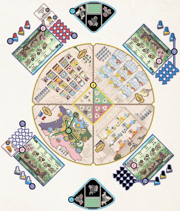 F) 各プレイヤーはランダムなプレイヤーボードを受け取ります。開始リソースを確認するには、リソースタイルを参照してください。あなたの左の区画のリソースと一致するリソースを2つ、反対側の区画に一致するリソースを1つ取ります。