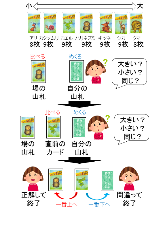 「大きい」「小さい」「同じ」か宣言し自分の山札をめくる。