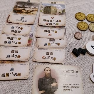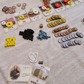 3人でプレイ。競りと生産&変換(資源orお金)として、お金を一番稼いだプレイヤーが勝ち。