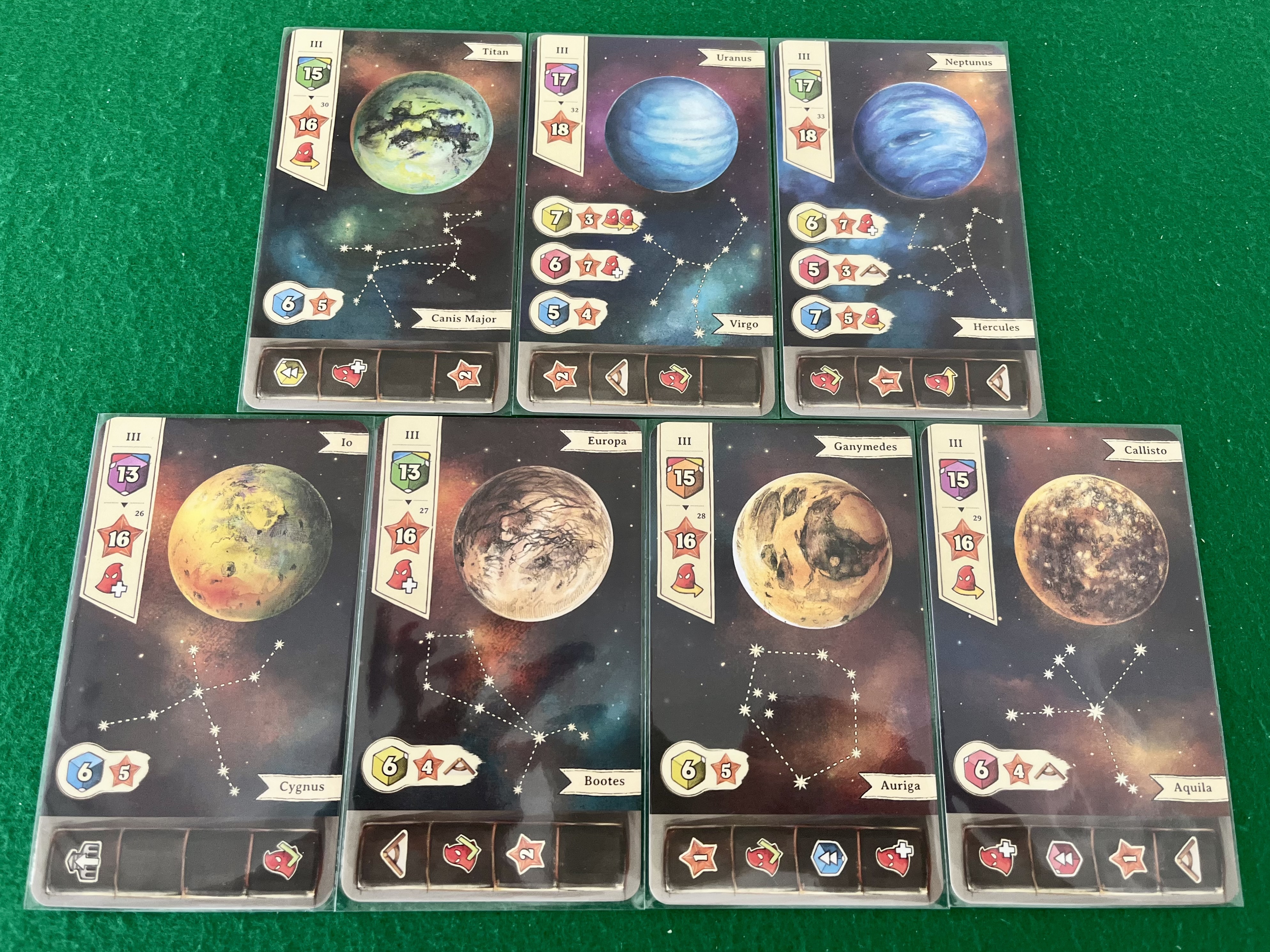 ↑ レベル3の惑星カード。デザインも美しい。箱絵でも分かるが、ガリレオだけに木星の衛星はポイントが高い。天王星の紫17や海王星の緑17など、かなり大きなダイス目を要するので、彗星を活用したい。惑星カードを得たら、90°回転させ図書館に置くと、本棚の一列となる。