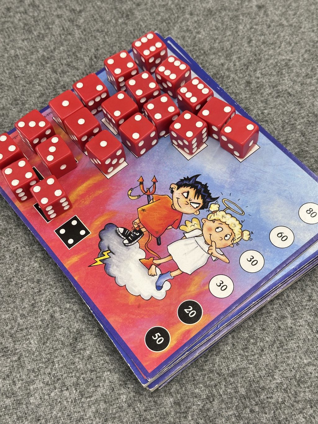 (白の丸はプラス点、黒の丸はマイナス点です。この場面で4の目が出たらマイナス50になります。もし4が無ければ手番は移り、次の人が被るか否か。)