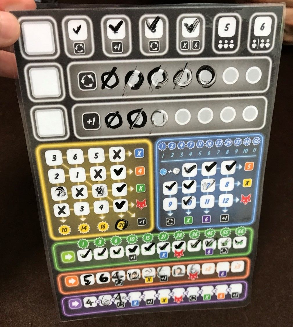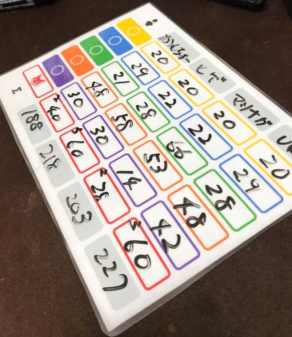 で、インストしてもらいつつ、どこが強いかとかどうやって点を取りに行くかとかだいたいどこで何点取れるといいだとか、そういう戦略的なアドバイスももらいつつの初プレイ!