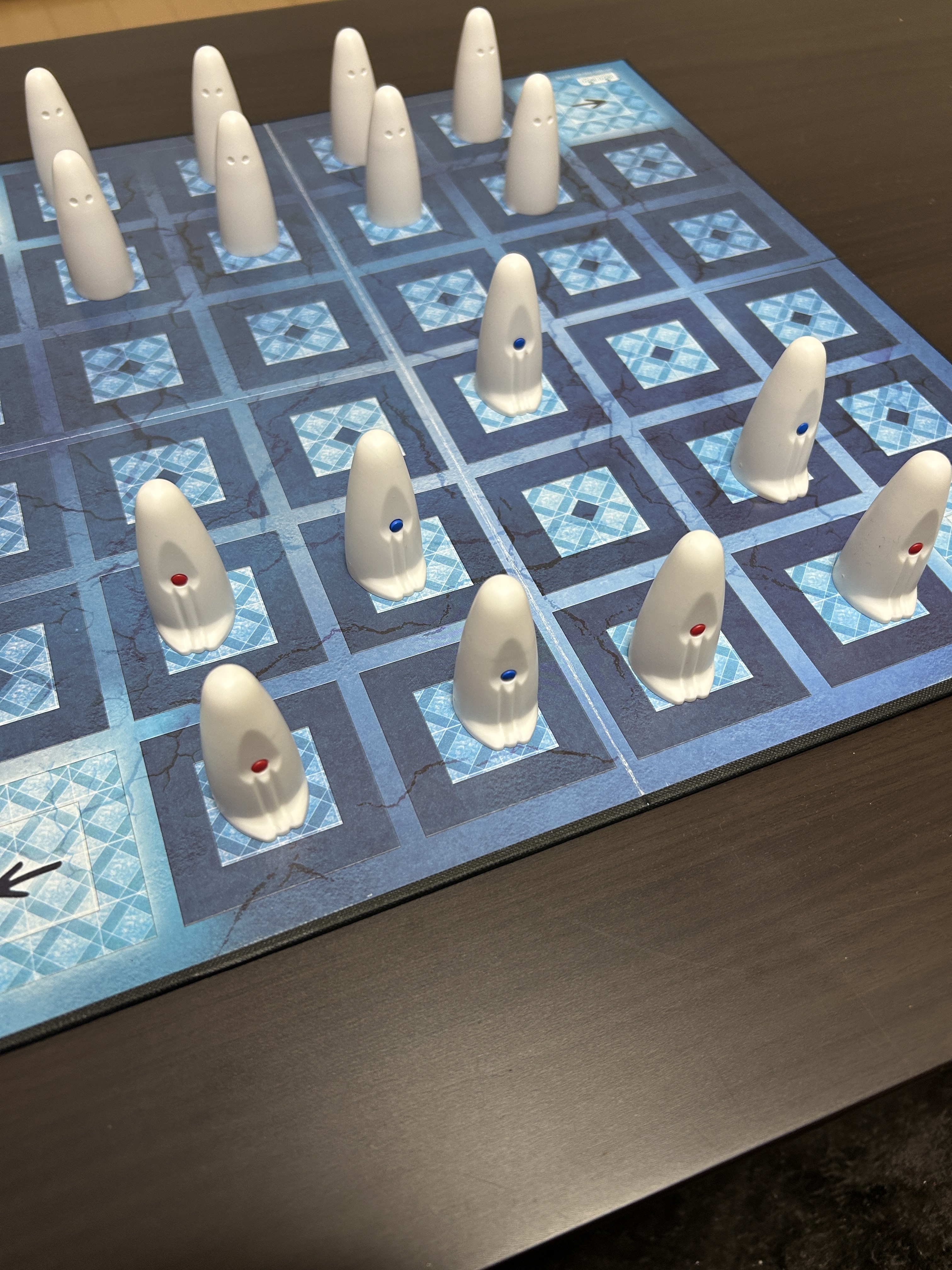 自分の一つ一つの動きが相手を惑わせる、将棋やチェスのような心理戦のゲーム。勝利条件は相手の青いお化けを全て取るか、自分の赤いお化けを全て取らせるか、青いお化けを敵陣の角から外に逃がすか、ただ何も考えずに動いてると、青いお化けに脱出されてしまいます!そして毎回と言っていいほど、究極の選択を迫られます!相手の顔色と動きを伺い、騙し、勝利をつかみとってください!