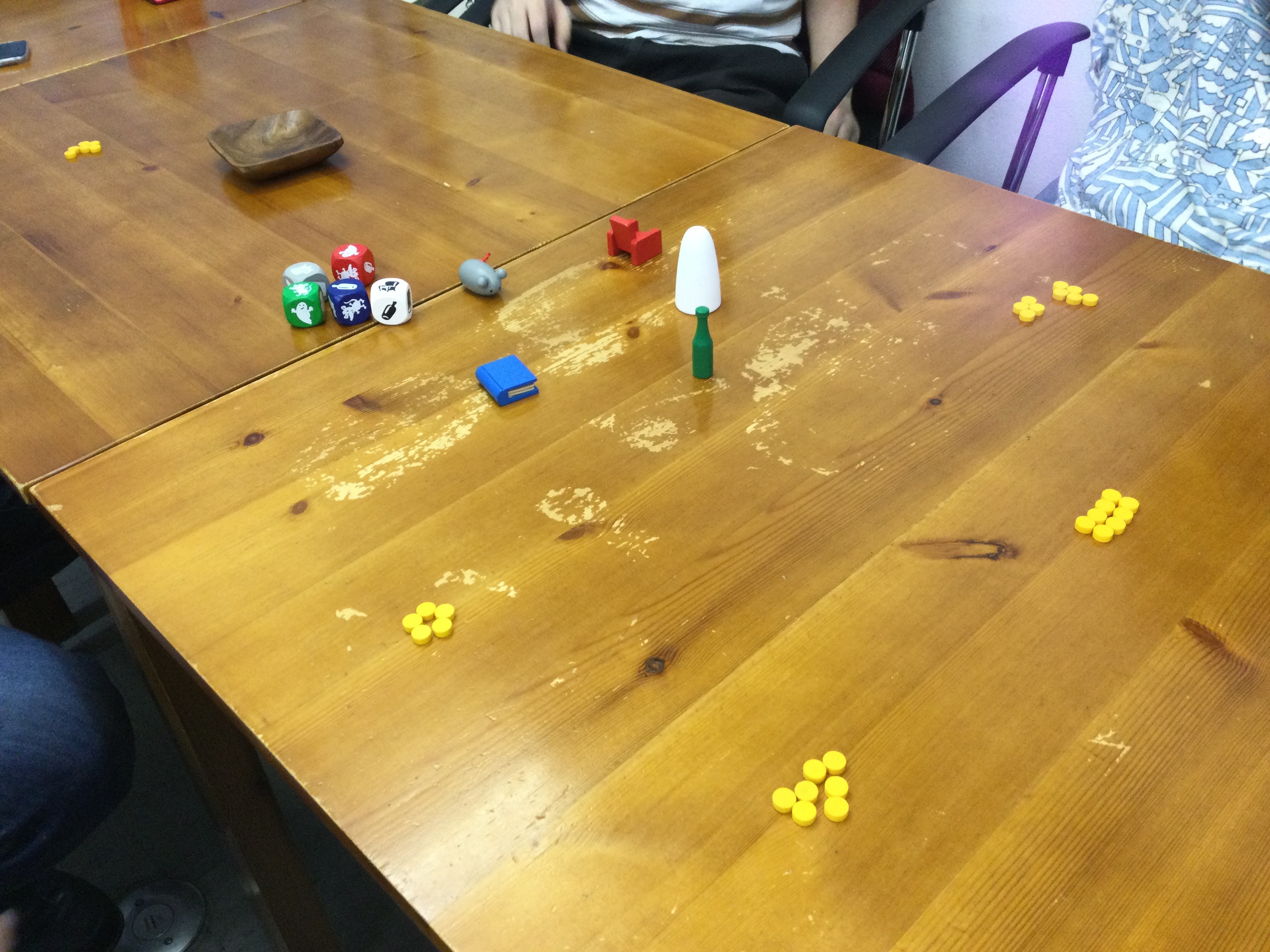 - 一番少ないダイス目の示す絵の駒を取る(本・本・ビン・ビン・おばけなら、おばけを取る)