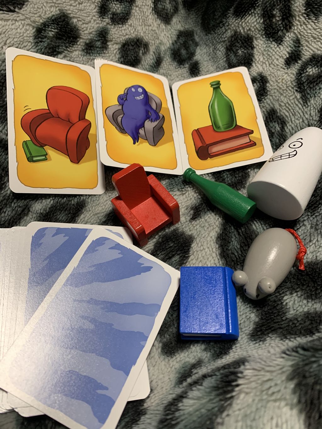 つまり、オバケが描かれているので白いオバケは×、オバケが青いので青い本も×、イスが描かれているので赤いイスは×、イスが灰色なので灰色のネズミも×、つまりこのカードが出た時に取るべきなのは、残された「緑の瓶」ということになります。