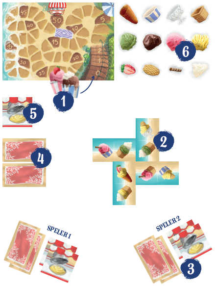 3. 各プレイヤーは、ランダムに2枚のアイスクリームタイルと2枚のアイスクリーム注文を受け取ります。これらは他のプレイヤーには秘密にしてください。