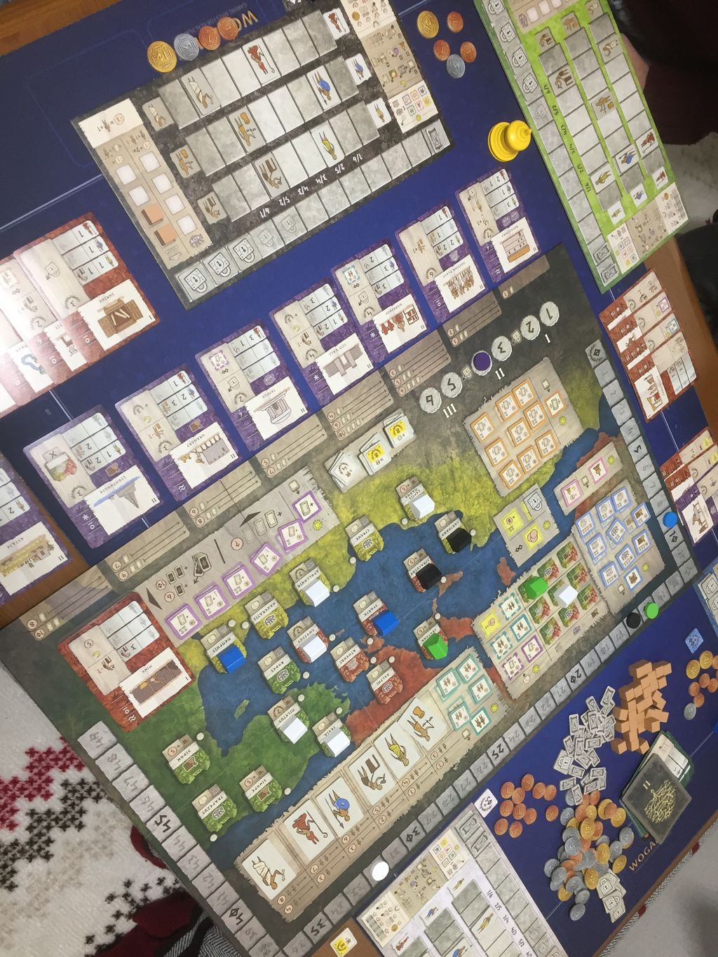 基本的にはこれらをぐるぐる行っていきます。もちろん、カードには先取り勝ちのところもありますし、配置することによる得点、ラウンド間の得点は建物からさらにボーナスがあったりと細かい点を説明しだすと止まらないぐらいあります。