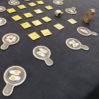 欲しい目玉焼きに狙いを定めてダイスを振り、出目が色なら目玉焼きの数の色に等しい数の同じ色のにわとりタイルをめくれたら目玉焼きを獲得できる。