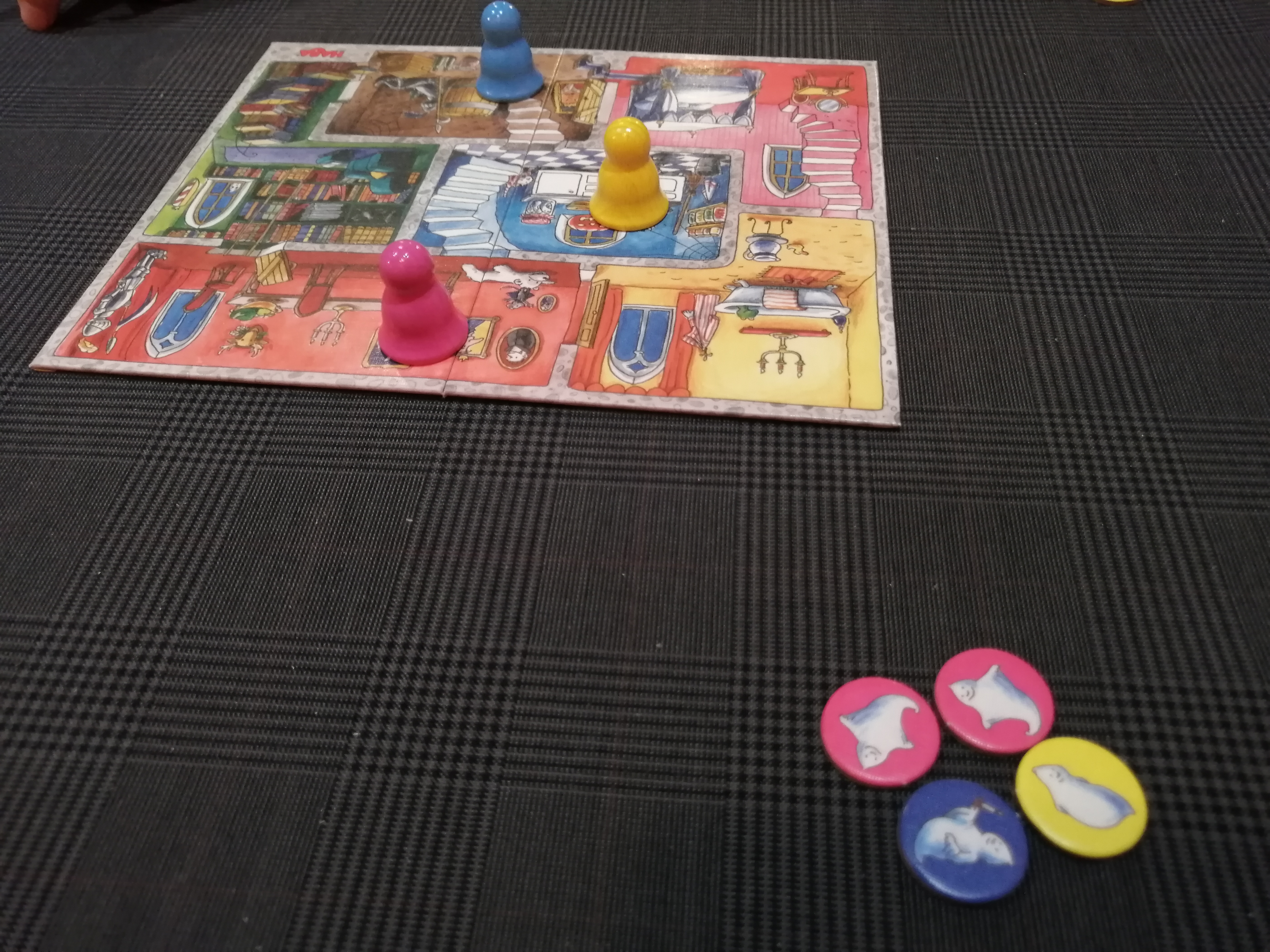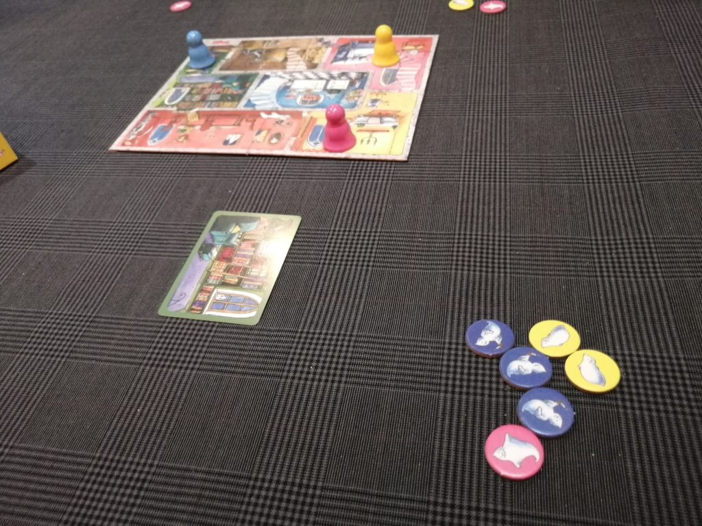 移動後にカードを公開して、カードと同じ場所に移動してたら驚いてチップを親オバケに渡します。つい「ギャー」と見つけれたら叫んじゃいます。