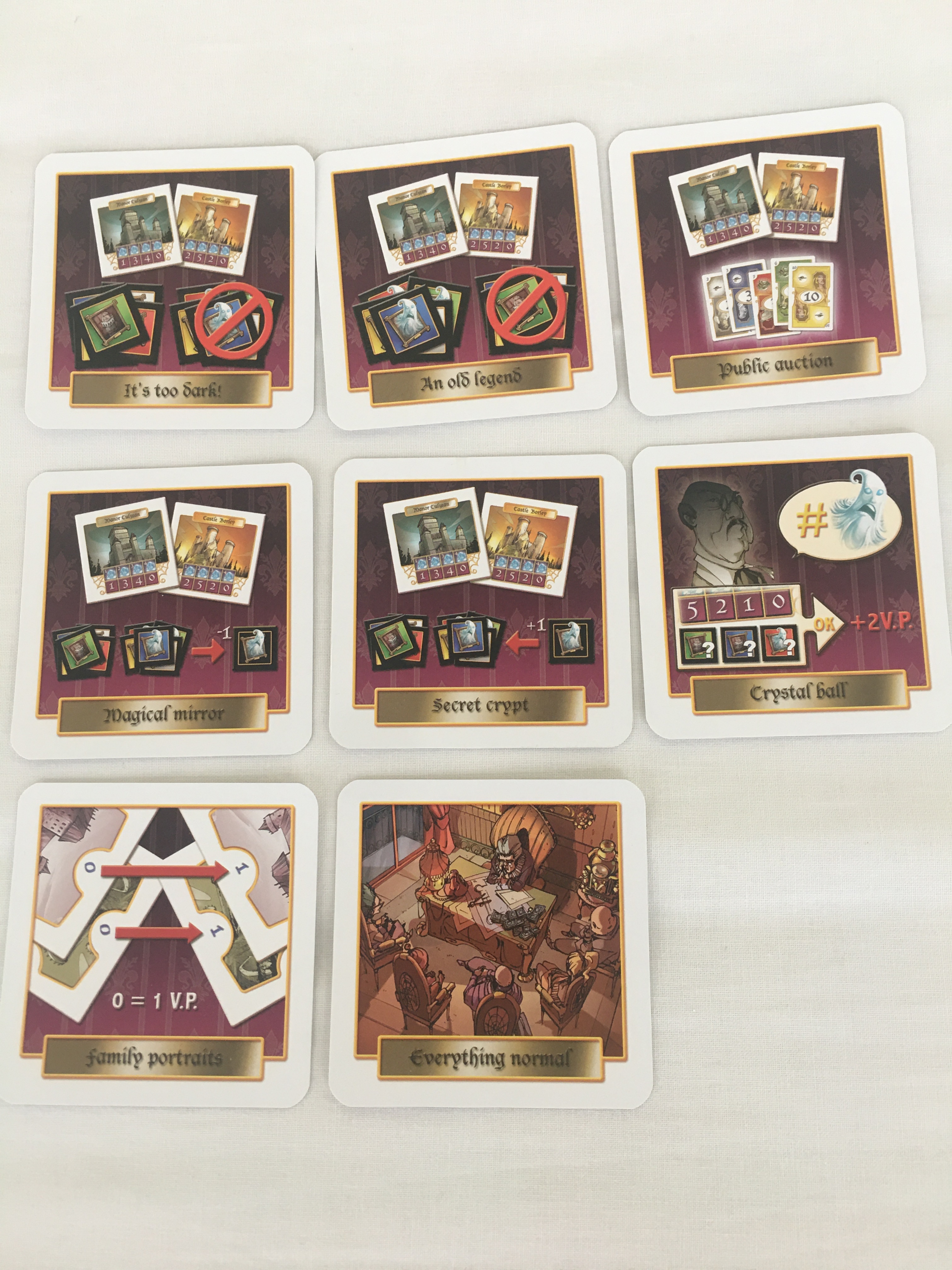 すべてのオークションの処理が終わった後、すべてのプレイヤーは「?カード」を表にし、宣言が真実だったのか嘘だったのかを公開します。これにより、それぞれの館の幽霊の数を計算し、得点を見ます。オークションで館の獲得したプレイヤーは、キャラクターカードの下に、得点が他のプレイヤーにわかるように獲得したカードを並べていきます。