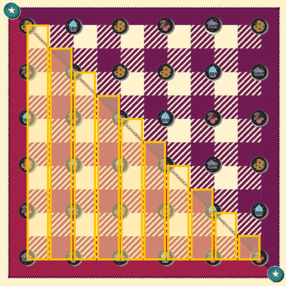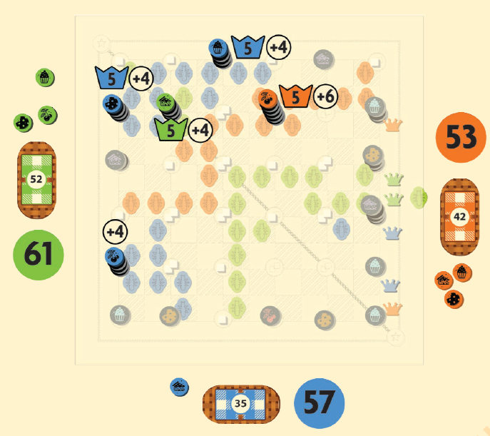 • お菓子のタイプごとに、そのタイプの最も背の高いストックを獲得しているプレイヤーは5ボーナスポイントを獲得します。最も高いストックが複数のプレイヤーで同数の場合、各プレイヤーは5ポイントを獲得します。