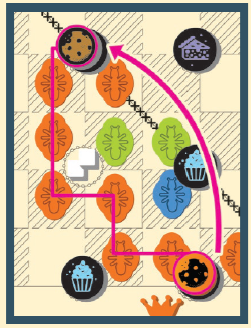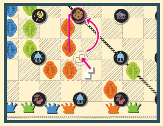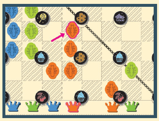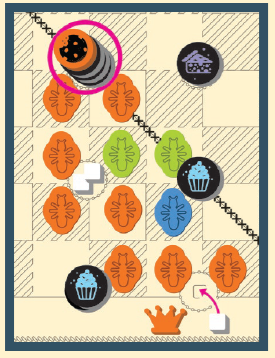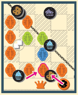 アレックス(橙)は、このターンでアリの配置により、2つのクッキーを接続し、接続の長さがアリ2匹であるため、2ポイントを獲得します。 |