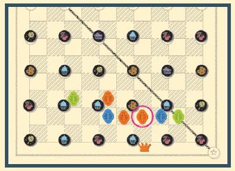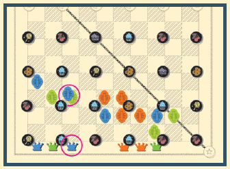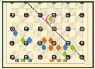 他のすべての女王はターン順に従い、女王が選択した行のスペースにアリを配置します。 サヒル(青)はアメヤ(緑)を押し出すことにしました。彼はアメヤの緑のアリを彼女に返します。 |