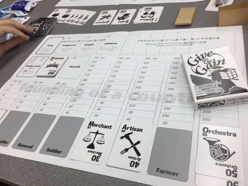 手番では、手札から1枚選び、誰かに渡します。その後に、渡したプレイヤーの手札からランダムに1枚手に入れます。