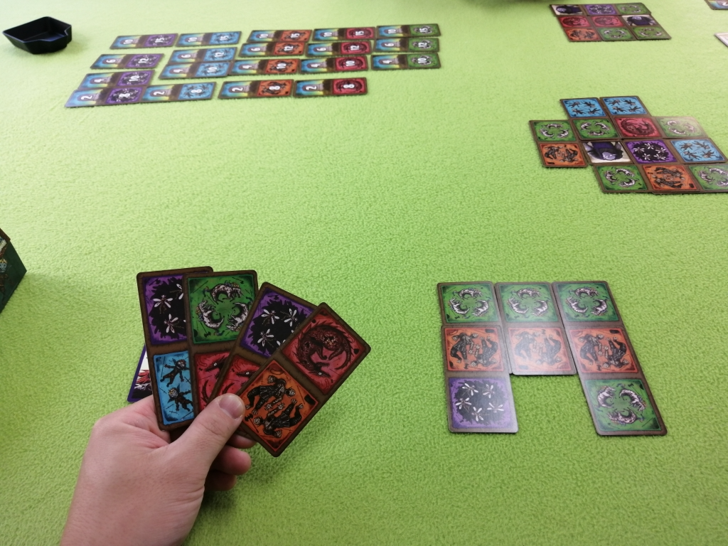 カードは早取りで高得点の墓掘りカードを狙うかどうかも共通の墓場の変化により合わせる必要があります。