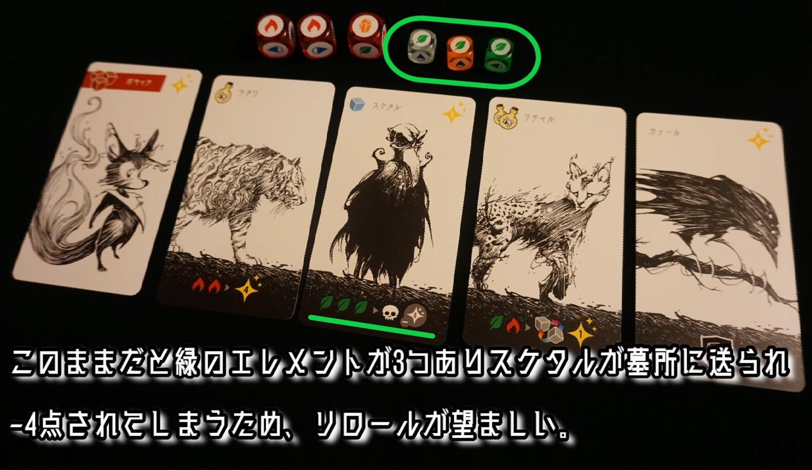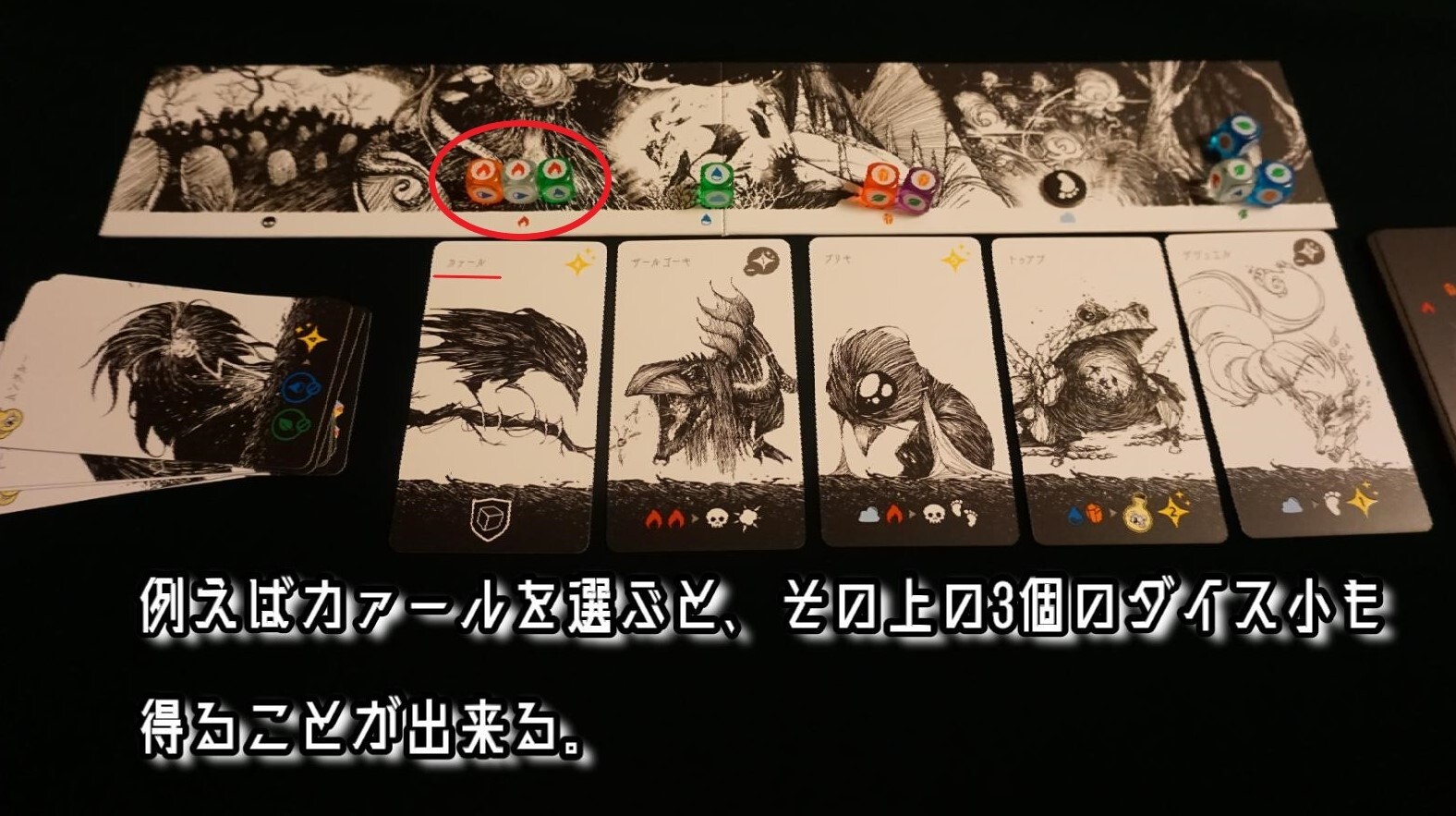 1日に出会う事の出来る5体の仲間を左詰めで順に各エレメントのシンボルマークの下に並べます。スタートプレイヤーは黒色ダイスを除くすべての小ダイスを振り、写真の様に出会いトラック上のシンボルと出目が一致するように配置します。