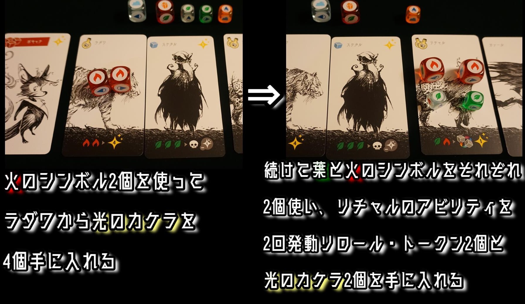 ④ダイス目によって獲得したエレメントはすべてのカードで1回ずつアビリティ発動に使用できる。そのため何度も重複して使用するダイスも出てくる。
