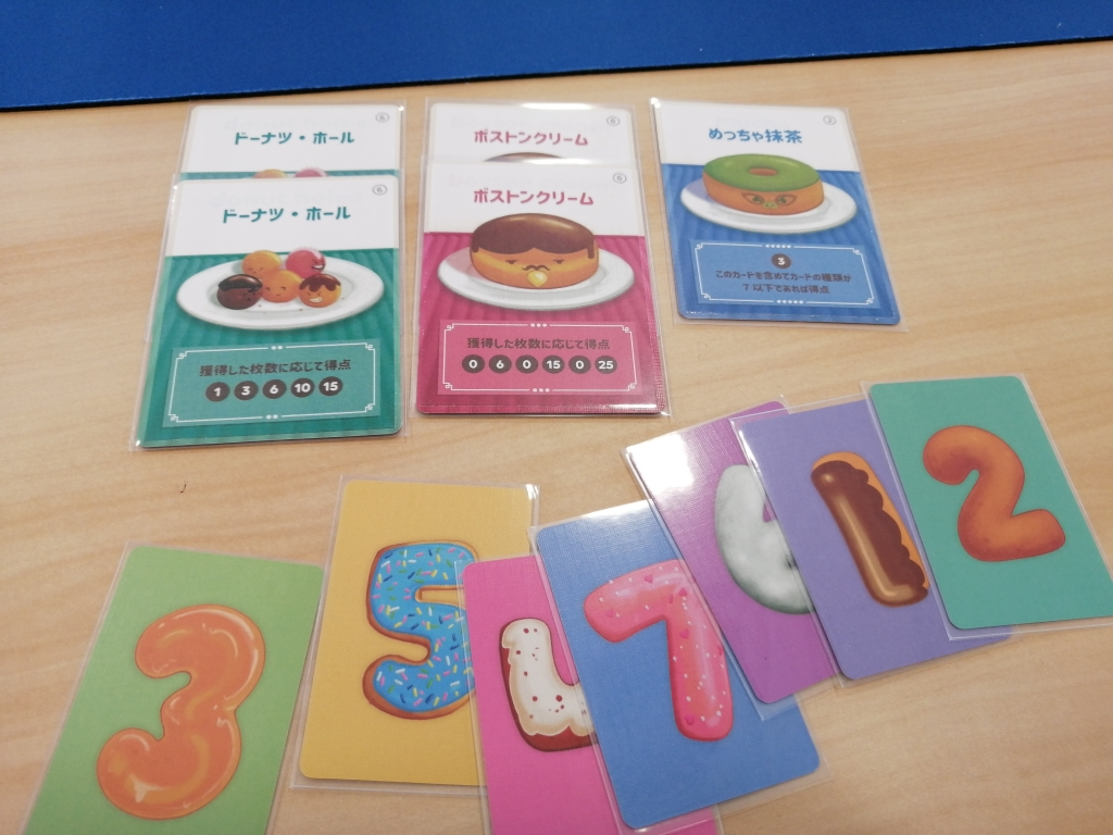 1〜7の数字列に並んだドーナツカードで欲しい数字を同時に公開して被らなければカードを獲得。