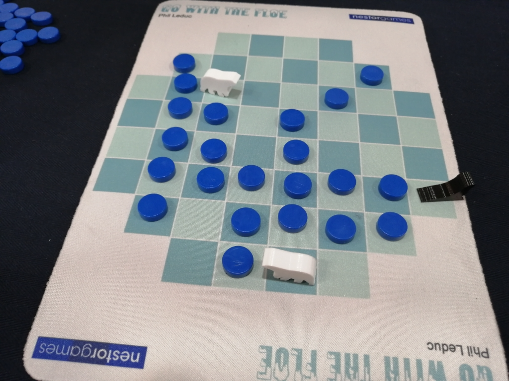 手番では自分のコマを1匹選んでタテ、ヨコ、ナナメで一直線で2マスまで移動させられます。移動させたら移動開始時や移動で通過したマスにチップを置き止まれなくします。