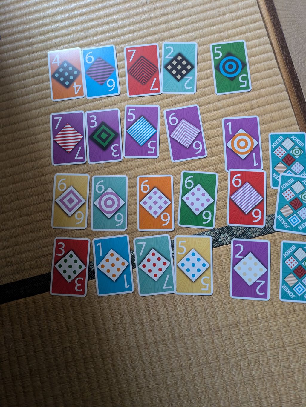 最低3枚の【色、数字、パターン】を揃っているなら手元に公開してプレイする。