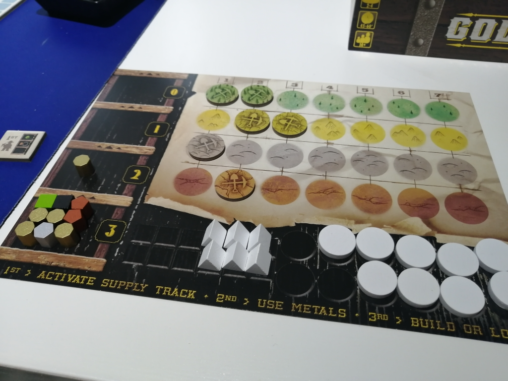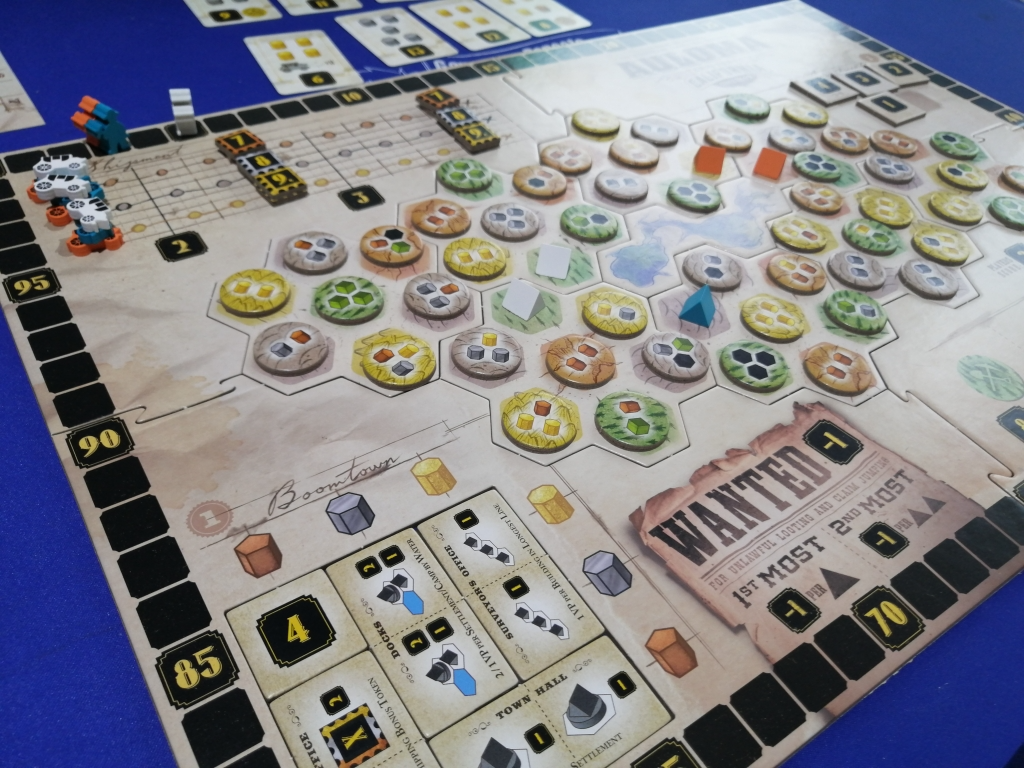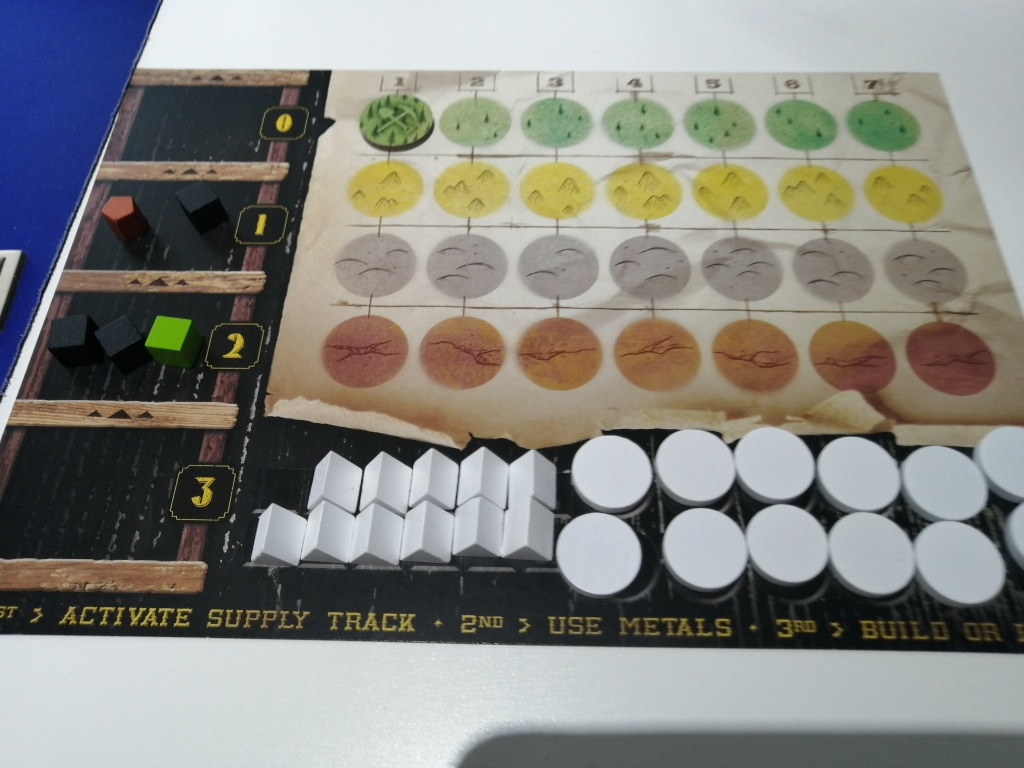 12アクション+1アクションしたら終わりのエリア争いや得点タイル、ボーナス得点争いのゲームで、ラウンド毎に個人ボードにある資源エリアを1つ選び、1個ずつ数字の小さいエリアに移動させていき、0から飛び出した資源を使用してアクションを実行します。