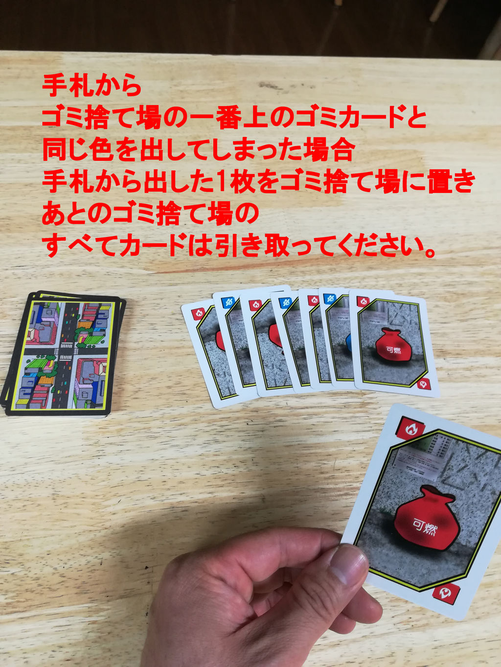 またゴミ捨ての場にカードが2枚以上あって一番上のゴミカードと同じ色のゴミカードを出してしまった場合、手札から出した1枚のゴミカードはゴミ捨て場に置き、いままで置いてあったすべてのゴミカードは手札に引き取ってください。