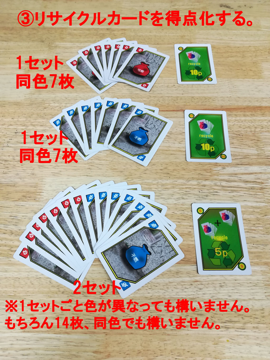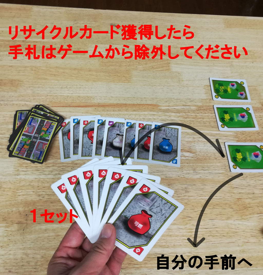 手札に1セットが出来ているなら、10点のリサイクルカードを獲得します。2セット出来ているなら、5点のリサイクルカードを獲得します。獲得したリサイクルカードは自分の手前に並べておきてください。セットの手札は、ゲームから除外します。箱などに仕舞っておいてください。
