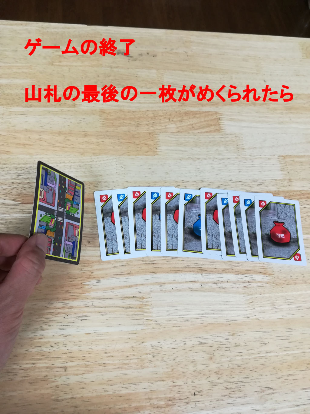 ゲームの終了が最後の山札の1枚めくった時、終了となります。もしゴミ捨て場の一番上のカードと同じ色のカードをめくったら、ゴミ捨て場のすべてのカードを引き取ってください。