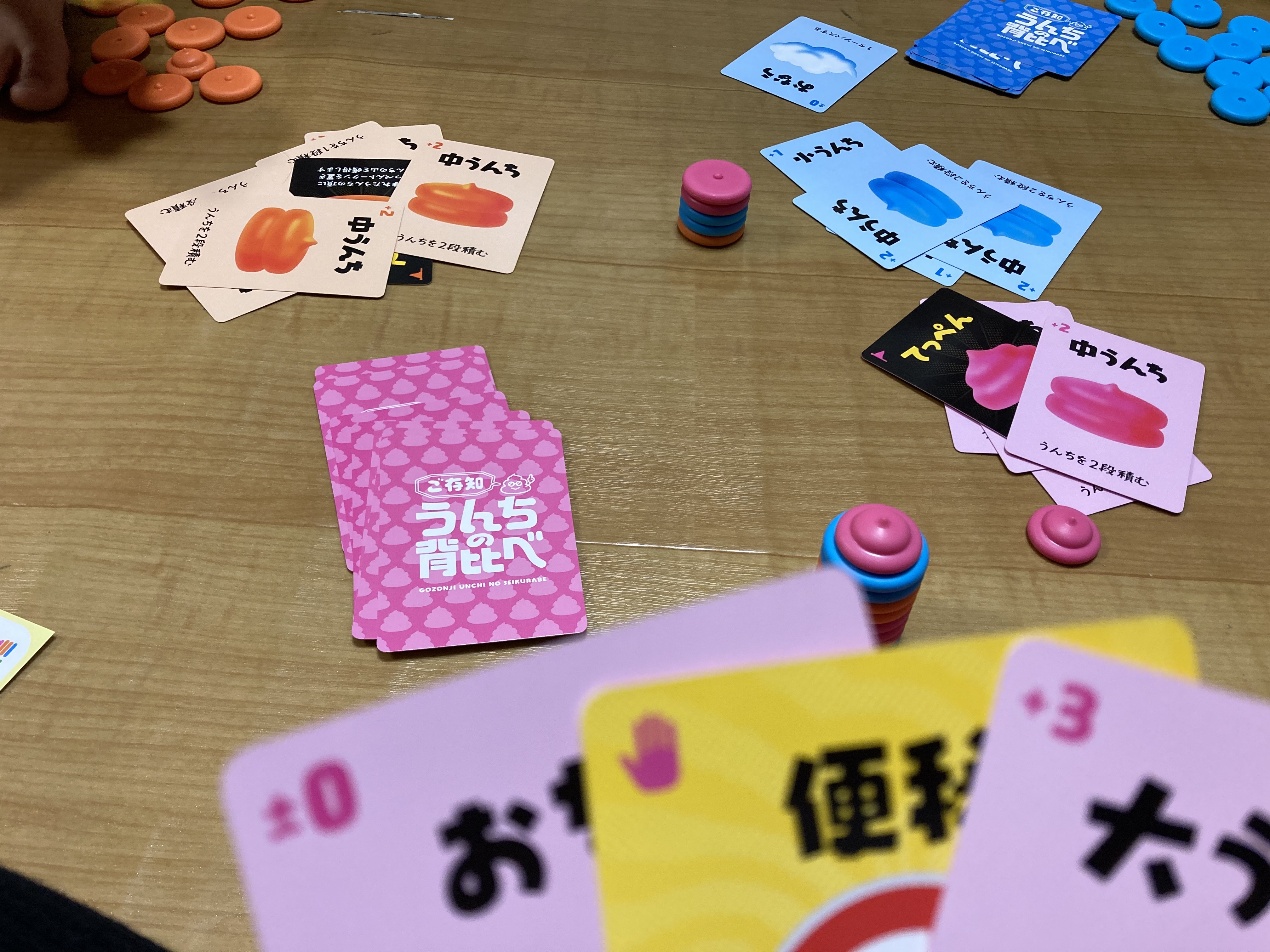 うんちカードには大・中・小があり、大はうんち3段、中は2段、小は1段を各自のうんちの山から、中央の山に積んでいきます。