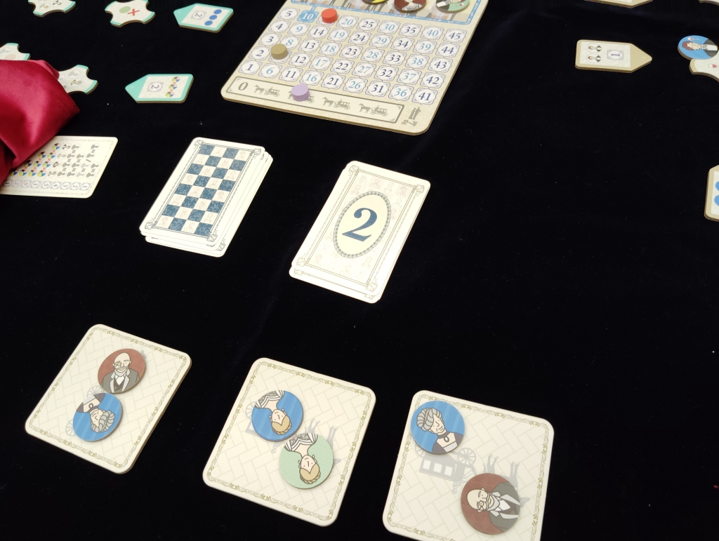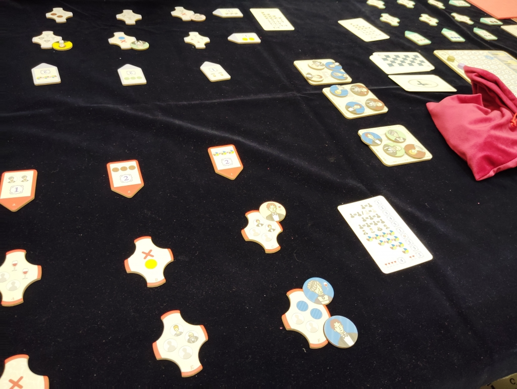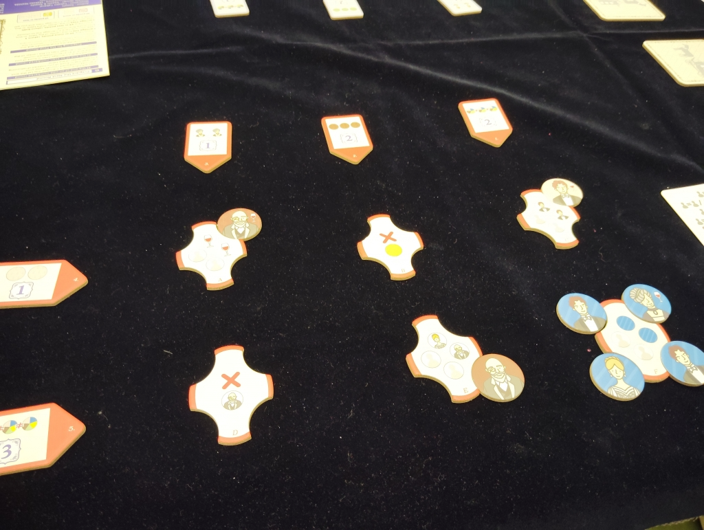 ゲームは9ラウンドで、毎ラウンド2〜4枚の客人タイルが人数分だけ用意され順番に選んで獲得して、貴族のもとに配置します。