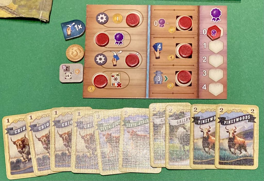 他にデッキを引いて捨てる+チップ/牛数を増やすチャート/ボーナスタイル効果などを上手く使い得点を伸ばします