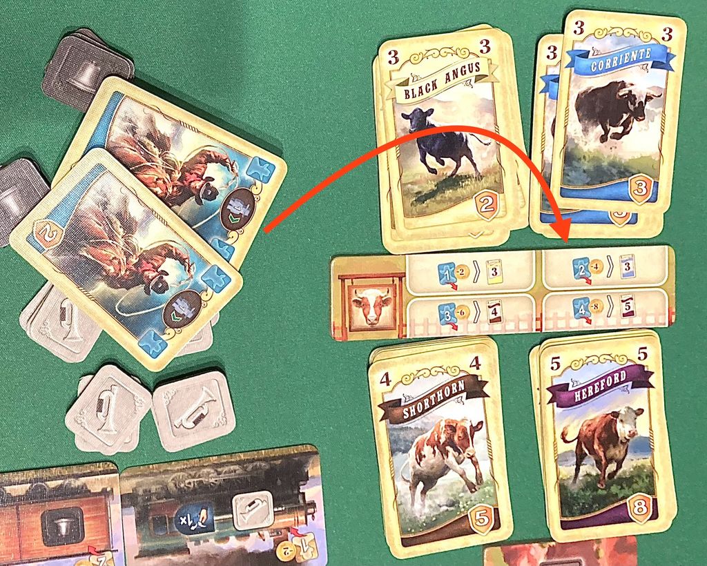 ↑🐂【牛の購入】手元のカウボーイを1〜4枚と1枚につき②金を支払い枚数に応じた牛カードを買い→使用したカウボーイと購入した牛カードは捨て札デッキへ置く(カード右下🟠内の数字はゲーム終了時の得点)