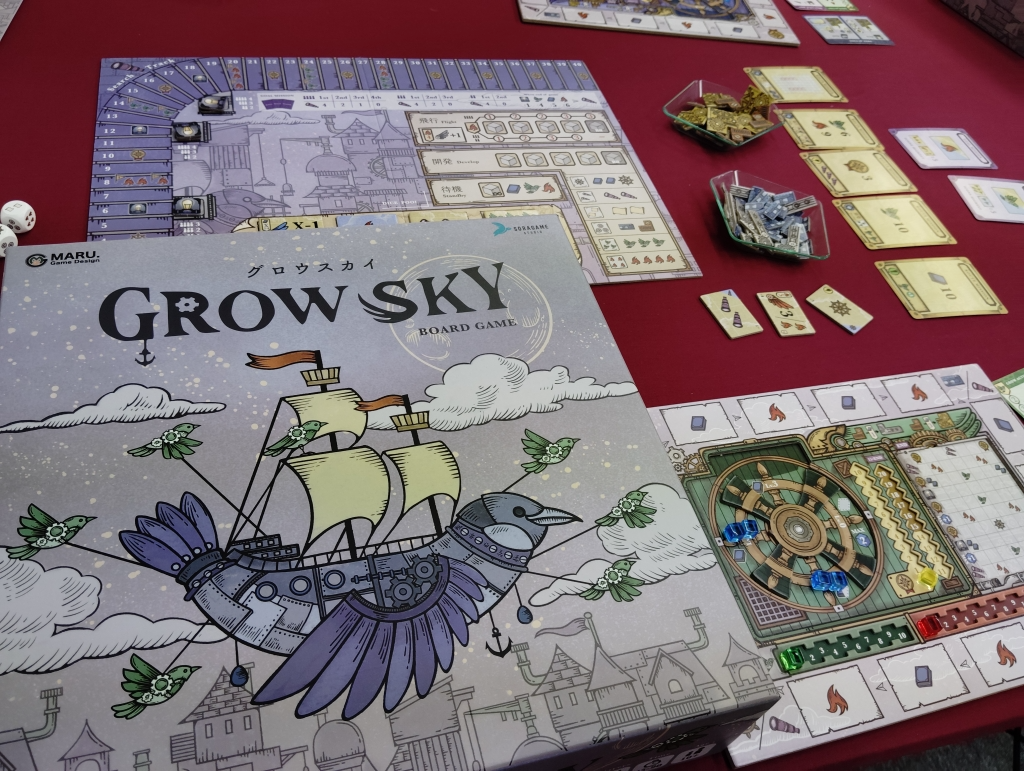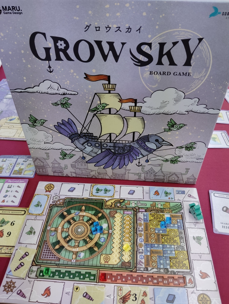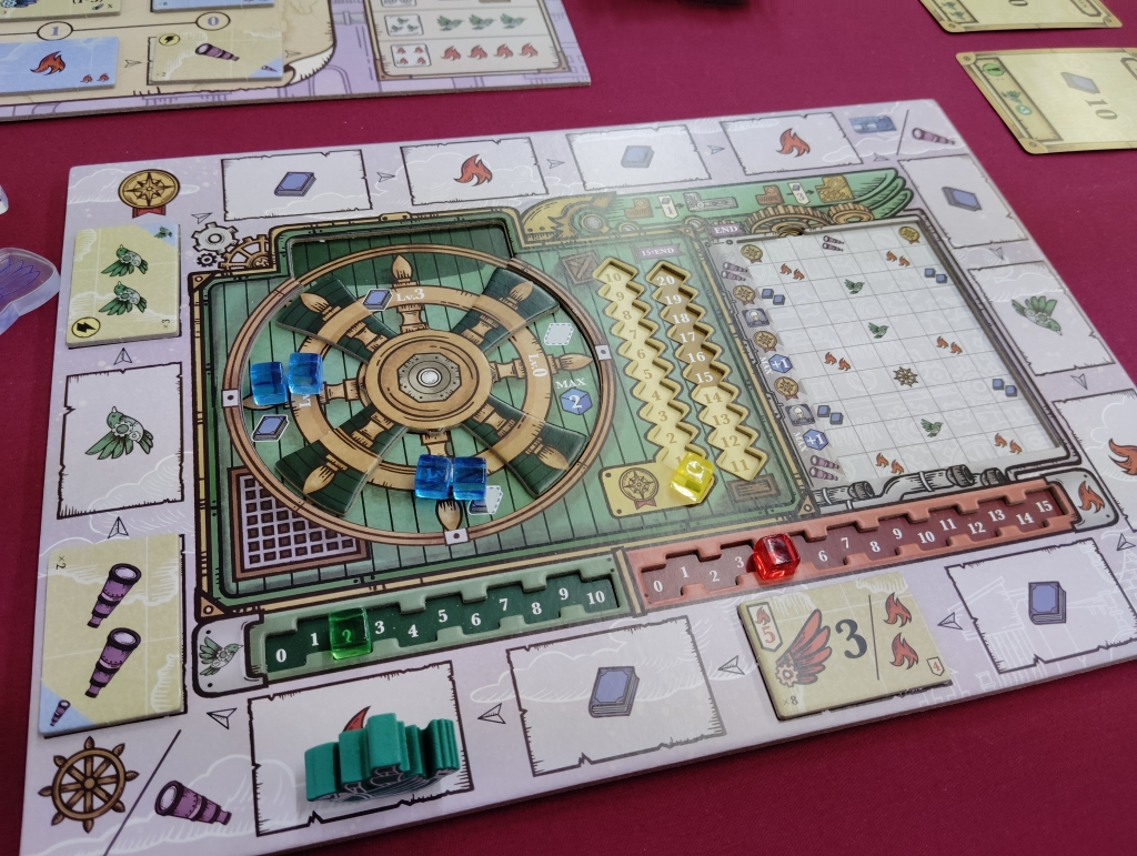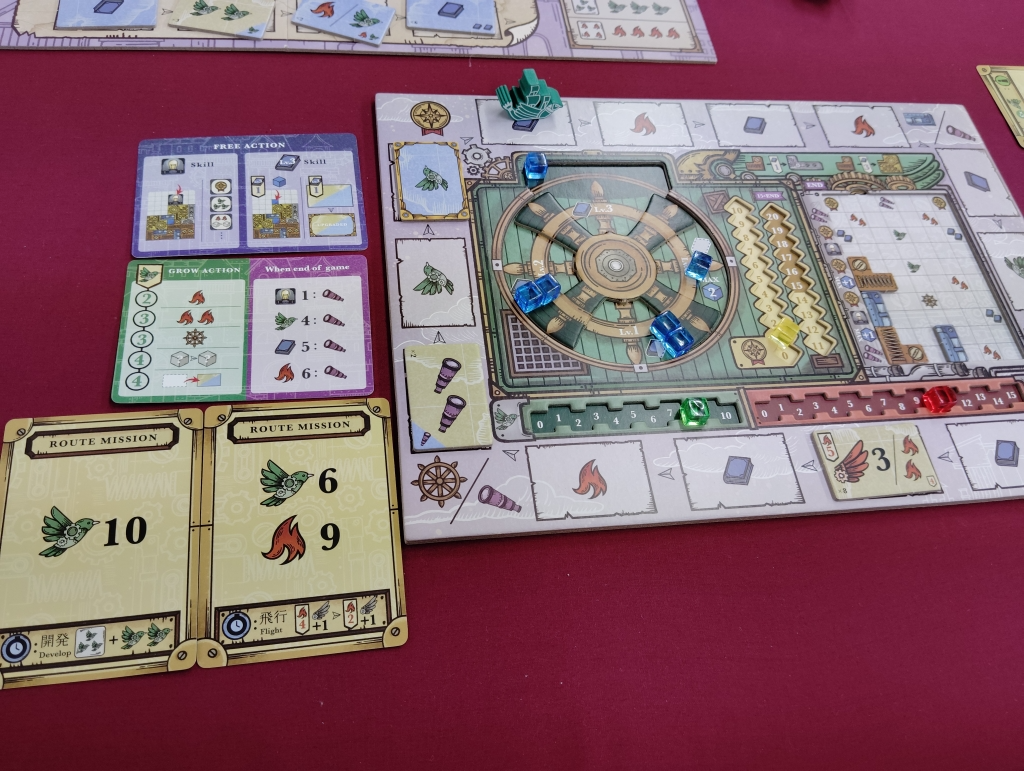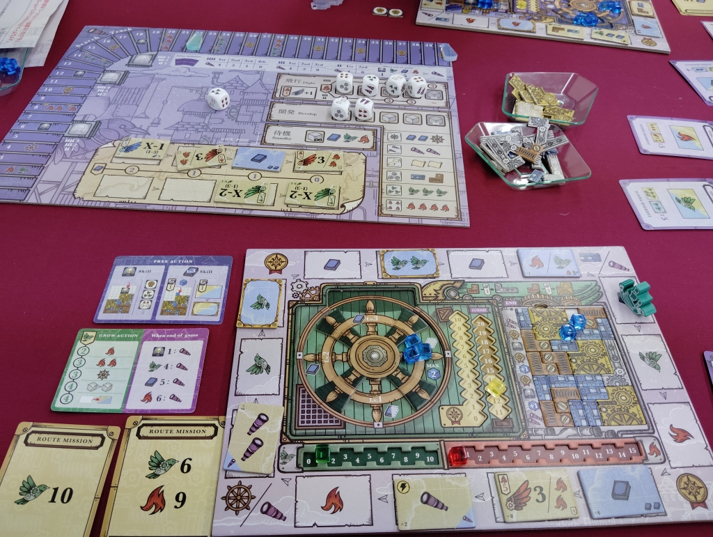 ダイスドラフトゲームで、飛行船のルート改革や資材や燃料管理やらをしつつ飛行船を進めたり改良をしていきます。