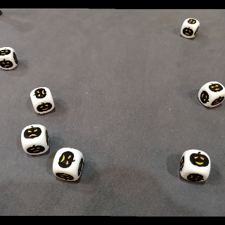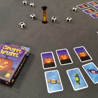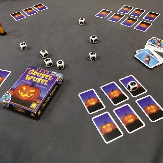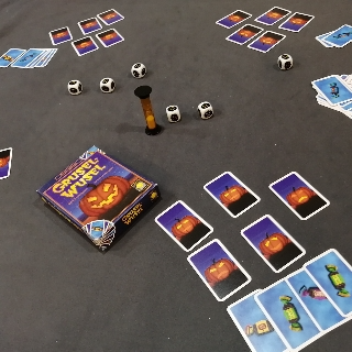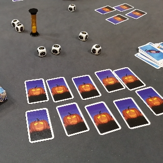いろんな表情のおばけカボチャがあり、均等になるようにカードを配ります。誰かが全てのダイスを振れば、砂時計をひっくり返してゲームスタート。ダイスの出目と合うカボチャがあれば、ダイスと一緒に左隣のプレイヤーに渡す。