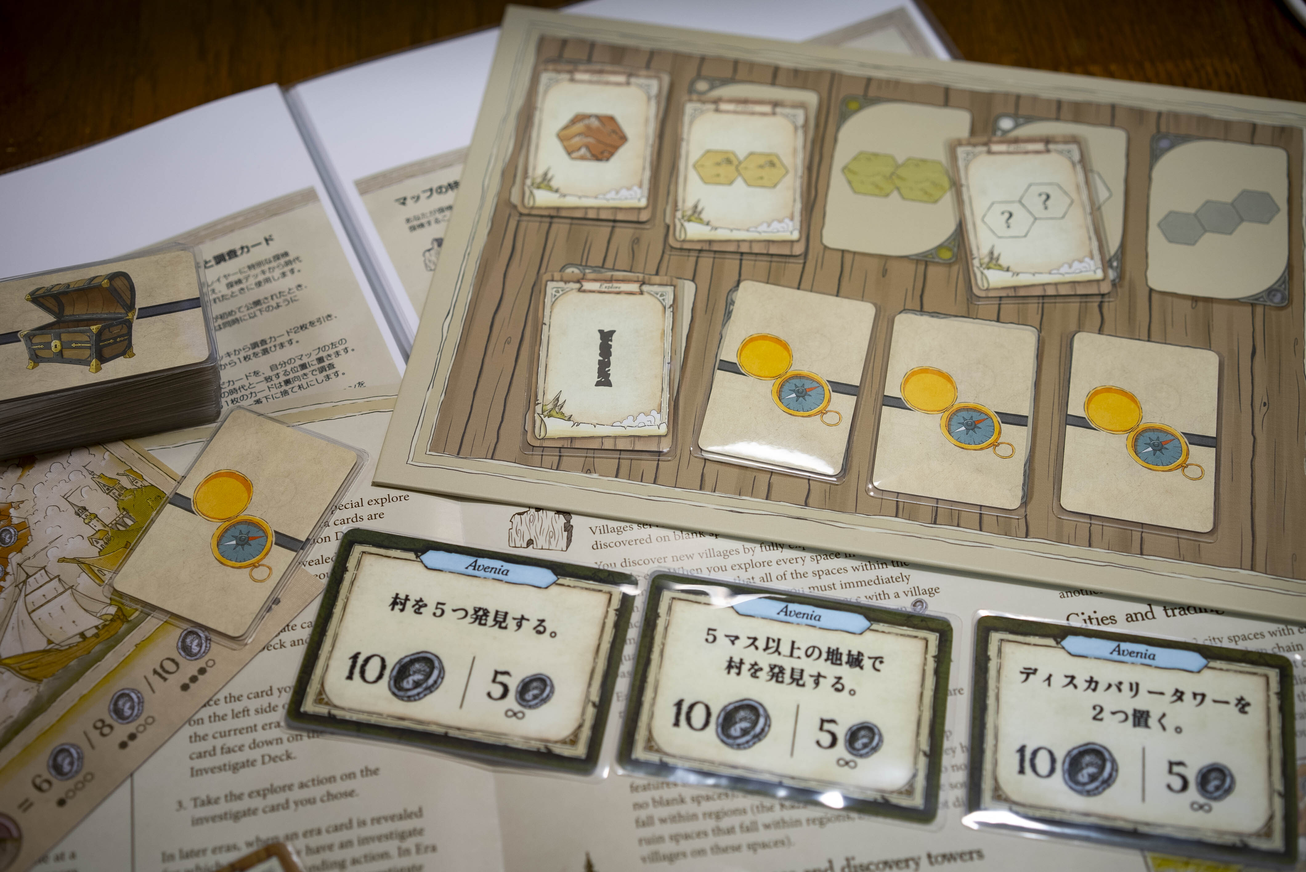 引き運に左右されるゲームですが、選択肢は用意されてるし、先々出るカードは決まっていて、予想しながらプレイするので、失敗しても不思議と納得感があります。時々「調査カードや探検カードの引に賭ける!」ってなるところも、伸るか反るかの勝負どころとして分かり易くて小気味良いです。後半は一気に点が入るし、邪魔される要素が何も無いので、気持ちよくプレイできる楽しいゲームです。