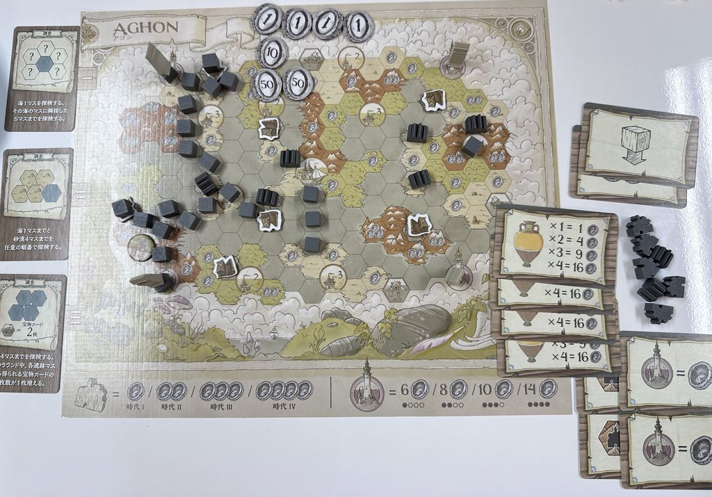特に1ラウンド目は、探索カード(進める場所とトークンの数が決まる)の枚数が少なく、配置条件によってほぼ選択肢が無いので楽しめません。(今回のカードのめくり順が最低だったのも原因。)