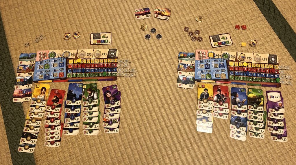 4人でプレイした感想ですが、序盤から中盤にかけてお金がカツカツなので、どのタイミングでカードを捨ててお金を得るのかと、ボーナスである金銀トークンにお金を消費するのかとても悩みます。