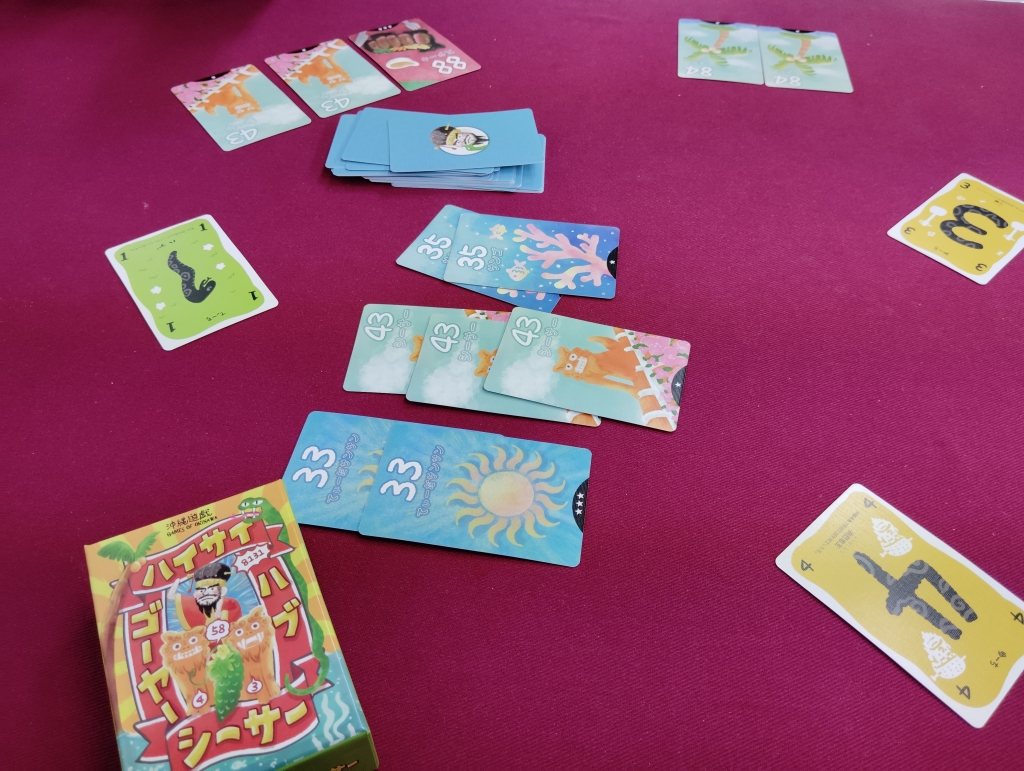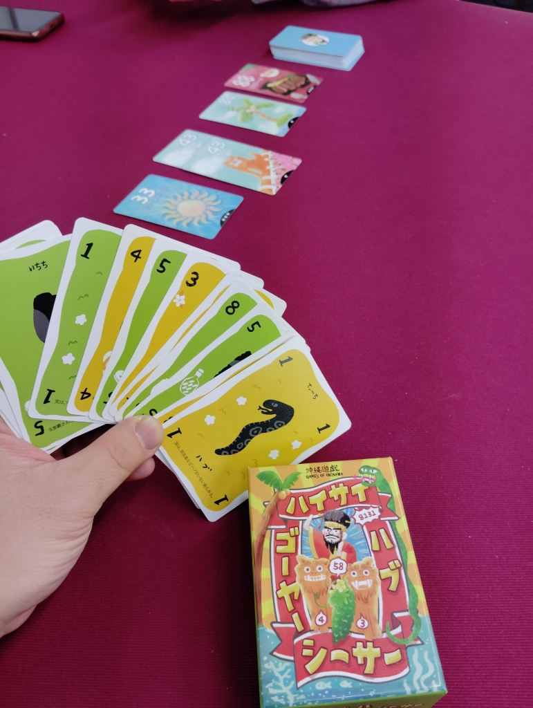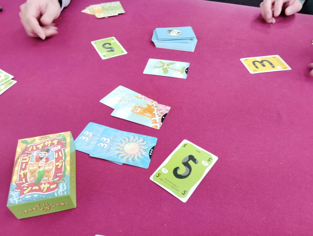 沖縄遊戯で、数字カードを同時に公開して数字の組み合わせに合う沖縄カードを宣言しながらの早取りゲーム。