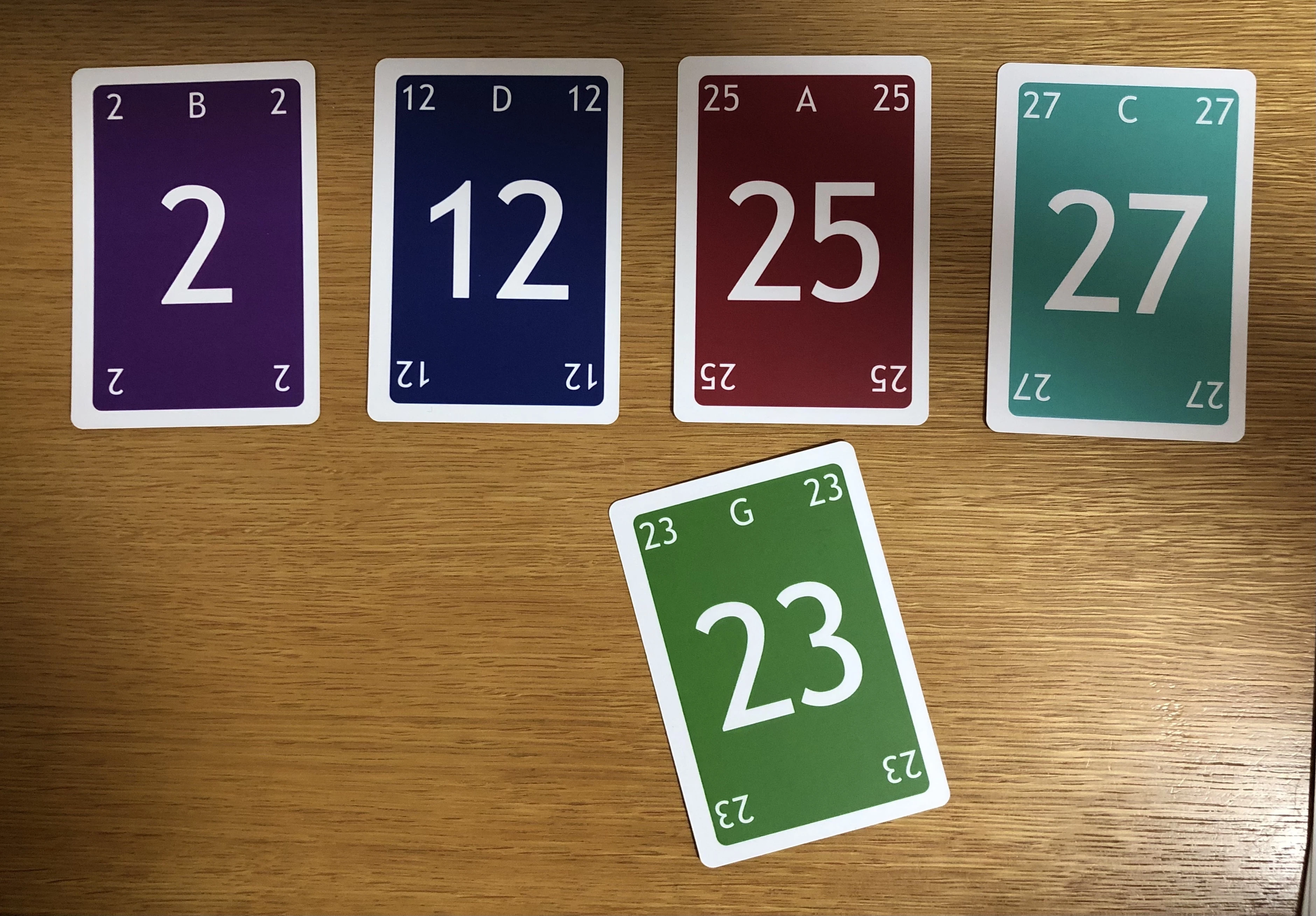 図の例では2,12,25,27と場にカードがあり、そこに23のカードを出す場合は23が左端になるように2と12のカードを引き取る、または右端になるように25と27のカードを引き取らないといけません。