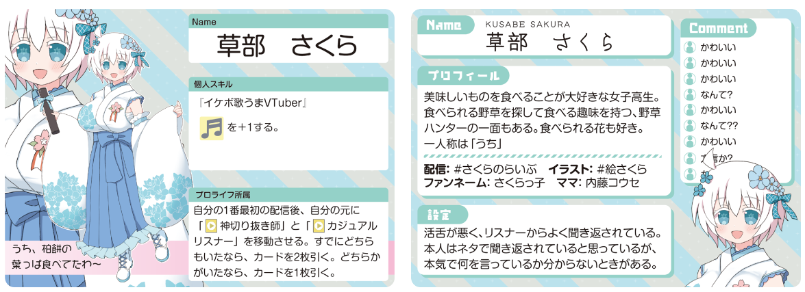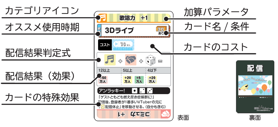 VTuber が行う配信内容を決めるためのカード。配信の出来によって登録者が増えていく。配信によってはコストや条件がある。