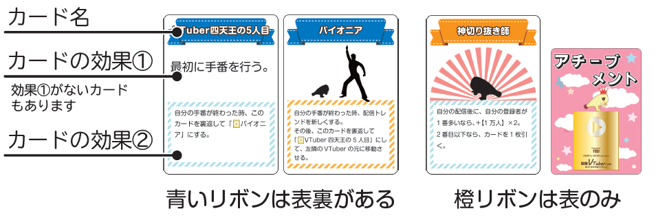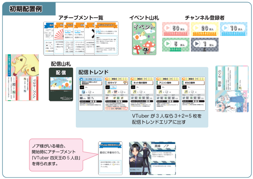 - ジャンケンなどで「VTuber 四天王の5 人目」(スタートプレイヤー)を決めます。「黒峰ノア」の中の人がいる場合、その人が「VTuber四天王の5 人目」になります。アチーブメントカード「VTuber 四天王の5 人目」をスタートプレイヤーの前に置きます。