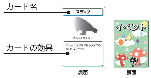 様々な状況を示すカード。VTuber に有利な効果をおよぼすものと、不利な効果をおよぼすものがあり、状況によって配信者の間を移動する。表と裏があるものもある。