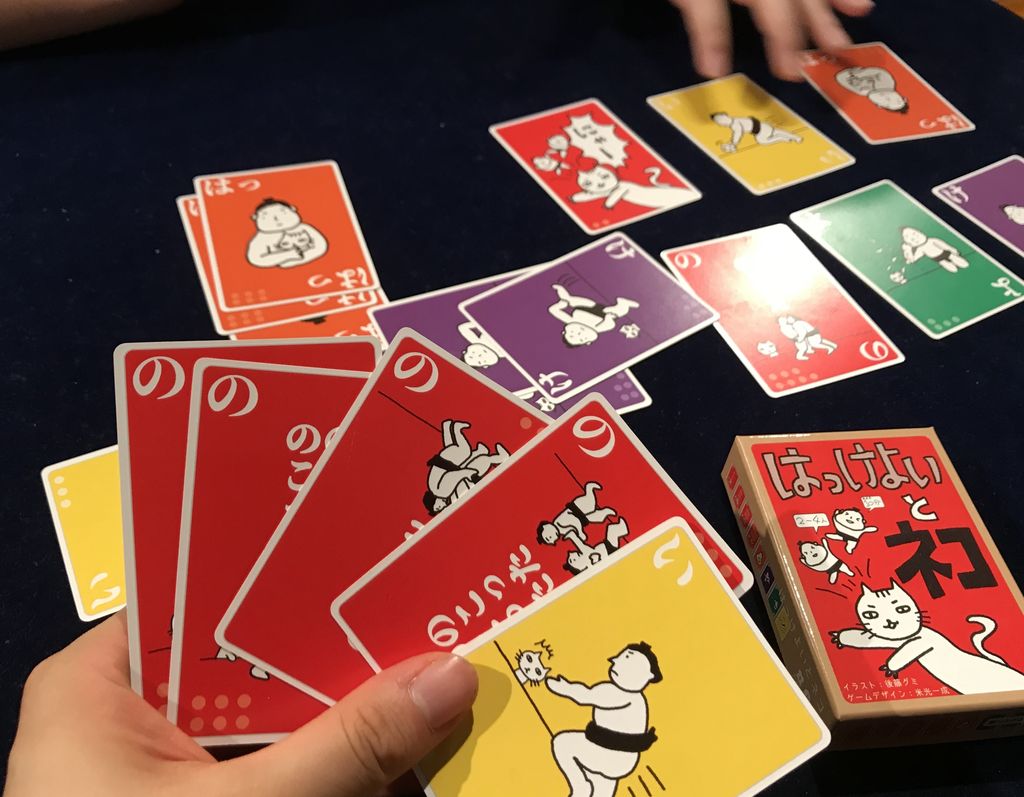 「はっ」「け」「よ」「い」のカードがそろったらスタートの合図で、相手を「のこった」しきれば勝利します。