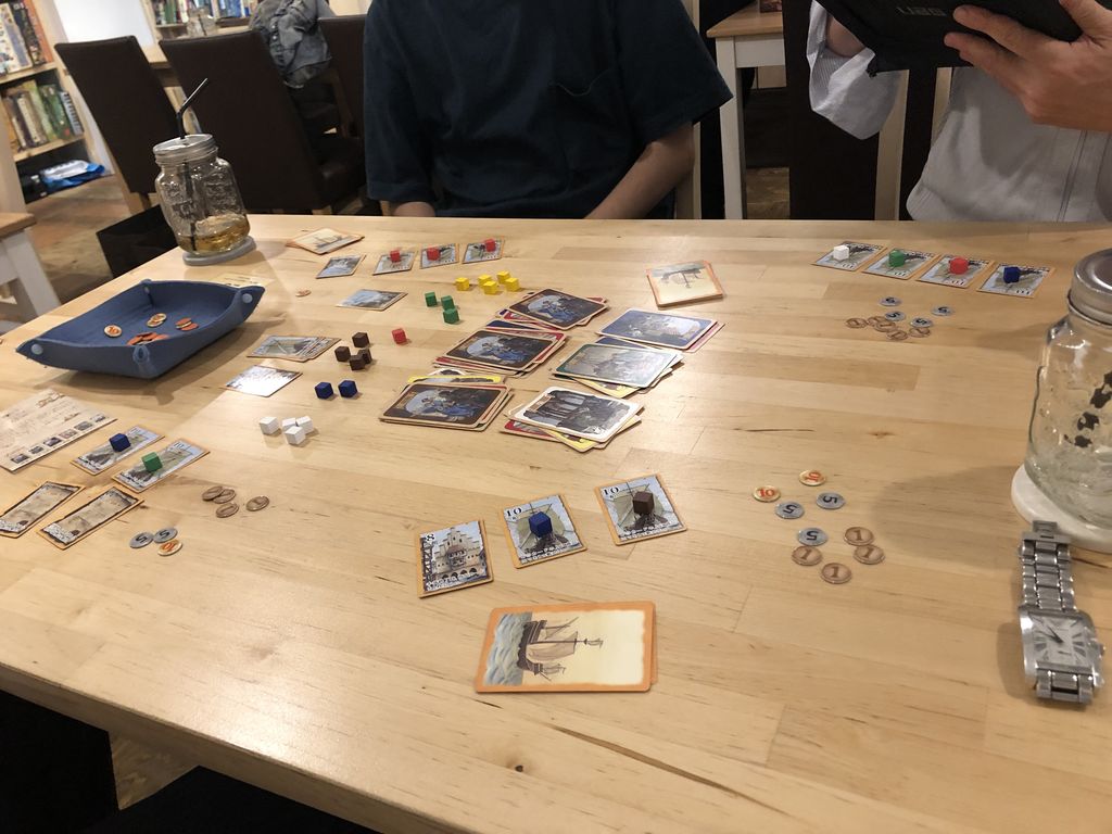 2回目はもう少しジリジリした展開となり、私は商館1枚で手札を増やして決算を狙い、S氏は船を4隻にして他のプレイヤーの決算でも収入が入ってくるようにし、O氏は協定を2枚買い決算の回数を高め、T氏は船3隻と荷役として一人勝ちを狙い、皆がトップを狙いました。