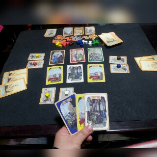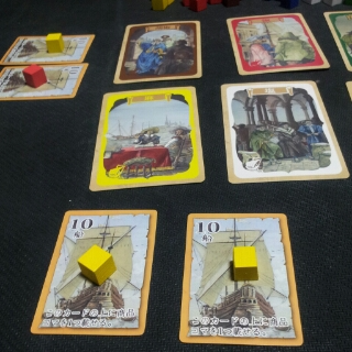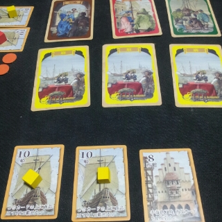 手番プレイヤーが出しましたカードと同じ色の商品コマを船カードに載せている全プレイヤーは、商品コマ1つにつき場にあるその色の商品カードと同じ枚数と同じ貨幣を獲得します。