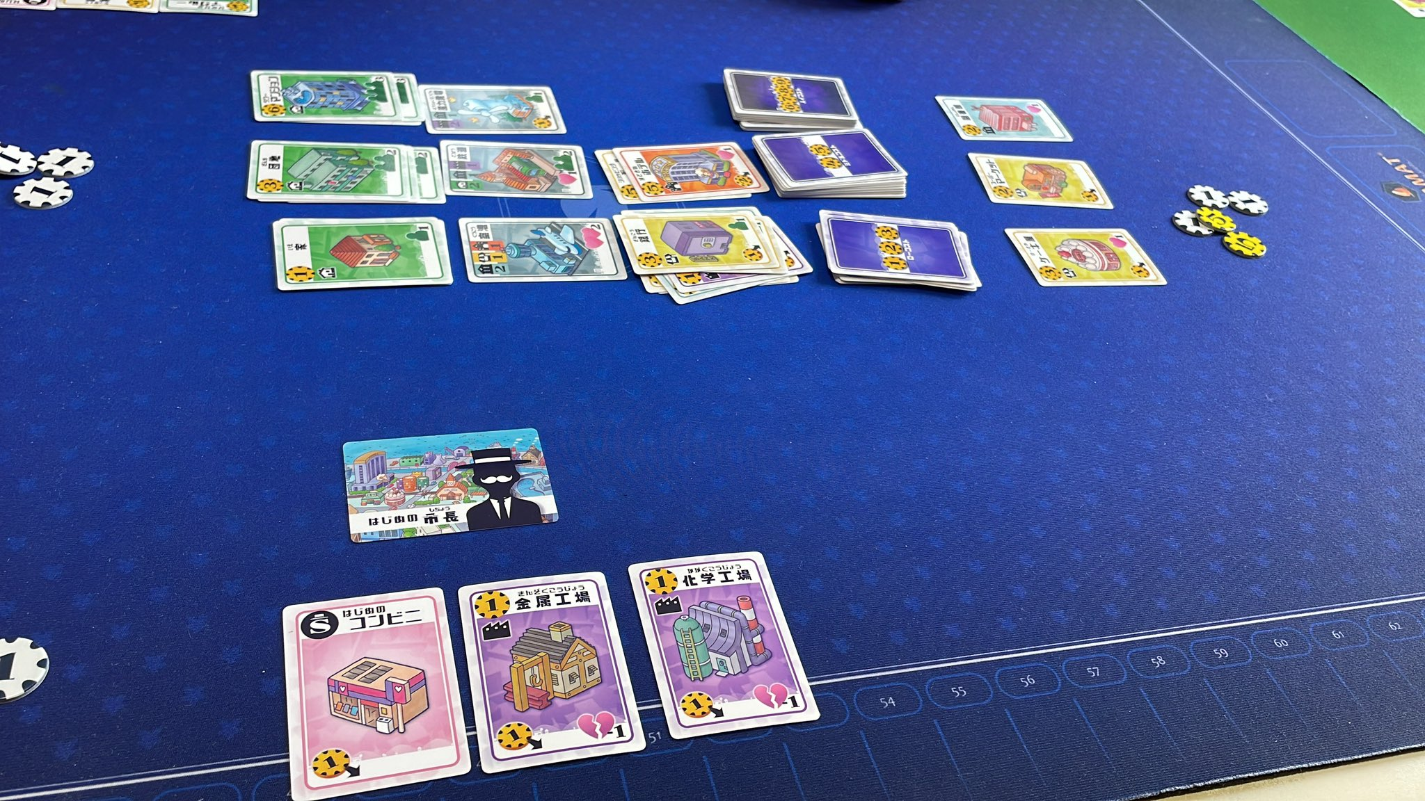 手番が来たら、自分の建物(最初はコンビニだけ)から収入を得て、場の建物カードをお金を使って買います。